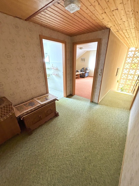 Ein freistehendes Haus aus der zweiten Hälfte der 70er-Jahre in citynaher Lage mit grosszügiger Raumaufteilung: Flur, Garderobe, GWC, Wohnküche mit zeitgemässer EBK, Wohn-/Esszimmer, ein Schlafzimmer und ein Bad im EG; Flur, geräumiges Duschbad und zwei grosse Zimmer im DG (eines davon mit Loggia) - insgesamt ca. 140 m². Der sinnige Grundriss erlaubt es zum einen, im Zweifelsfall ebenerdig wohnen zu können - zum anderen können sich Eltern und Kinder auch auf zwei Etagen (jeweils mit Bad) verteilen. Das Haus verfügt über eine Fussbodenheizung (im EG & DG) und ist somit für eine evtl. Änderung der Heizungsart (jetzt: "BUDERUS"-Öl) gut vorbereitet. Offener Kamin im Wohnzimmer, ALU-Fenster und Haustür, schickes/helles Treppenhaus, insgesamt sehr ordentlicher/gepflegter - wenn auch z.B. im Bereich "Sanitär" nicht mehr ganz aktueller - Zustand. Hinzu kommt ein vielseitig zu nutzender Teilkeller mit angenehmem Raumklima und eine Garage. Auf dem schönen - ca. 880 m² grossen - Grundstück (BRWert = EUR 120,-/m²) findet sich ein Garten- und ein kleines Gewächshaus. Legen Sie einen Nutzgarten an oder stellen Sie Planschbecken, Schaukel und Trampolin für die Kinder auf - Platz ist hier ausreichend vorhanden. Verwirklichen Sie Ihren Traum vom eigenen Haus - optimieren Sie Ihre Lebens-/Wohnqualität und werden zugleich Anleger und Investor.... - mit dem besten "Mieter", den Sie sich vorstellen können: Ihnen !