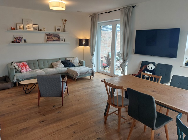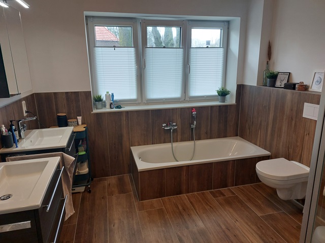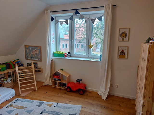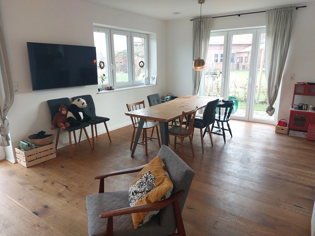 Diese exclusive DHHälfte wurde 2022 in Zeven / OT Oldendorf mittig des gewachsenen Dorfkerns erstellt. Der gut durchdachte Grundriss bietet im EG ein großes Wohnzimmer, eine halboffene Küche mit EBK, einen HWRaum mit Nebeneingangstür, ein Gäste-WC und eine Diele mit Abstellraum unter der Treppe. Im DG befinden sich drei nahezu gleich große Zimmer, ein Bad mit Dusche und Wanne und ein Flur mit Einschubtreppe zum Spitzboden ; insgesamt ca. 123 m². Zum Mietobjekt gehören eine Terrasse, ein Carport mit Außenabstellraum und ein großer Garten. Folgende Ausstattung erwartet Sie : hochwertige EBK, Fußbodenerwärmung im ganzen Haus, Designfliesen, Eiche-Echtholzdielen in Wohn- und Schlafräumen, Netzwerkkabel in allen Zimmern, Sat-Anlage und eine Terrasse mit Echtglasüberdachung. Energiesparsamer KfW 40+ Standard mit Wärmepumpe und Erdwärme-Tiefenbohrung - kombiniert mit einer hocheffizienten Lüftungsanlage. Der Ortsteil Oldendorf ist nur wenige PKW-Minuten von Zeven-Stadt entfernt und auch mit dem Rad gut zu erreichen. Er liegt zudem direkt am Naherholungsgebiet "Grosses Holz" und ist teilweise noch durch landwirtschaftliche Betriebe geprägt. Die Verbrauchskosten rechnen die Mieter direkt mit den Versorgern ab. Diese tolle DHHälfte kann zum 1. Juni 2024 neu gemietet werden.